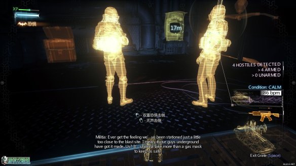 又遇到了一扇闸门,按F到达上层之后发现下面有大批的敌人,不过他们的位置距离闸门开关很远,可以直接下去开启闸门而不会被发现。
