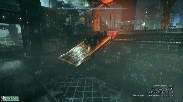 这里需要将蝙蝠车也开进去,如法炮制,将吊板移动到如图所示的位置,形成一个斜坡,之后开着蝙蝠车用航行模式直接开进去。