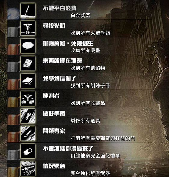 [乐游网导读]最后的生还者PS4版即将发售,全新的奖杯成就系统带来震撼体验,下面就为玩家带来PS4中文奖杯列表 全DLC奖杯列表大全。