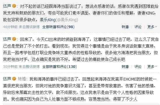 2009的关系一度闹的很僵。近日在上海举行的Chinajoy,两位当事人都来到了上海,经过一番沟通,双方都对曾经做过的一些事情表示歉意,并在微博上发表了自己的感慨,表示接下来将会一同为电子竞技的发展做出努力,同时海涛也邀请了2009加盟他即将举办的Dream cup赛事担任解说。