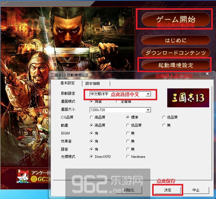 点击“开始游戏”之后会出现如下对话框,请按照图片指示操作,设定语言和开始游戏。