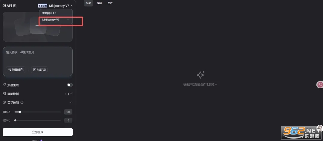 这样我们就进入到了文生图创作窗口,它这里有两个模型可选,一个是Midjourney v7,另一个是夸克图片1.0。我们选择MJ V7,然后进行文生图