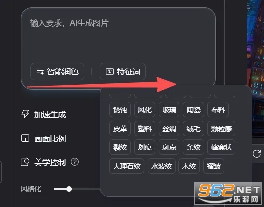 除了上面这些贴心的地方外,还有一是【特征词库】,分了7个板块(人像、镜头视角、光线、风景、结构、动态氛围、质感细节),涵盖了120多个关键词。让我们在写文生图提示词时,能更加准确