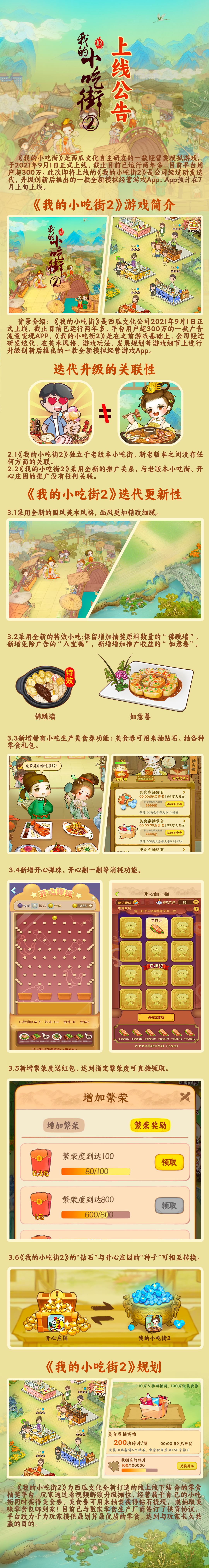 《我的小吃街》是西瓜文化公司2021年9月1日正式上线,截止目前运行俩年多,平台用户超300万的一款广告流量变现APP.《我的小吃街2》是在之前游戏基础上,公司经过研发迭代在美术风格,游戏玩法发展规划等游戏细节上进行升级创新后推出一款全新模拟经营游戏APP