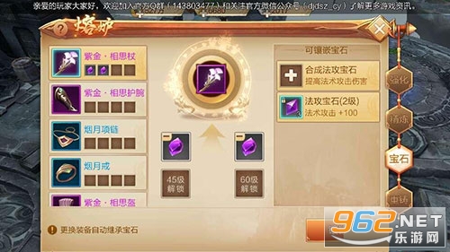 不同部位的装备需要镶嵌不同的宝石 宝石可以加成气血攻击暴击防御等多项属性 宝石栏随着等级逐步解锁 宝石等级越高加成属性越高 高级宝石可以用低级宝石逐级合成