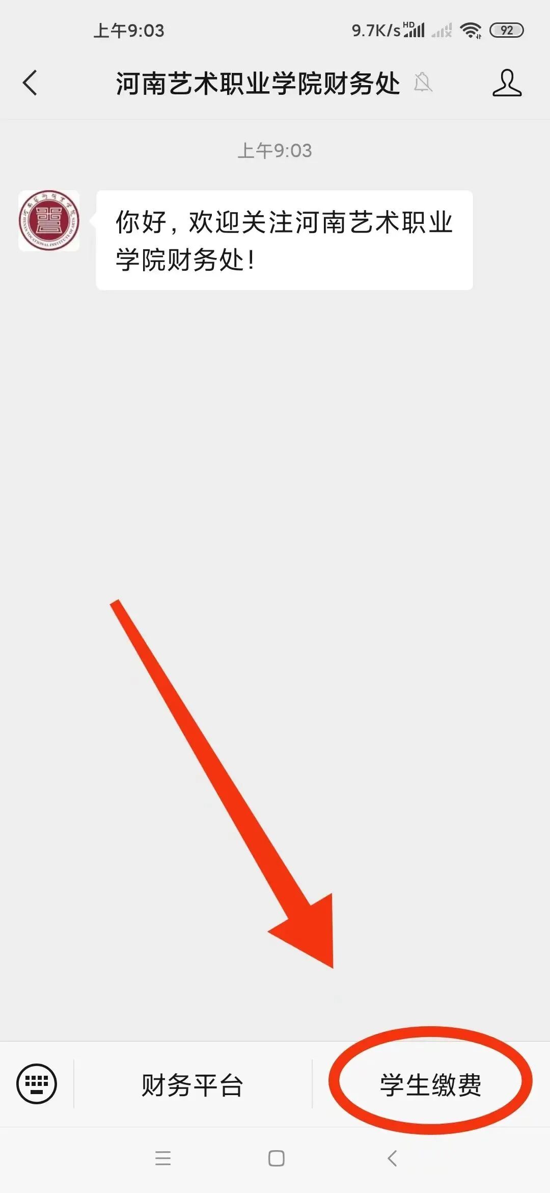 ①搜索并关注微信公众号“河南艺术职业学院财务处”