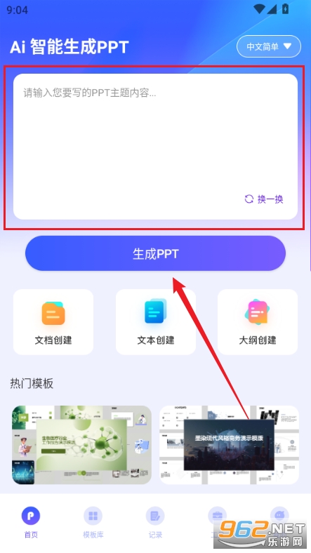 1、进入软件后,可以输入想要的主题,点击生成ppt,ai会自动一键生成
