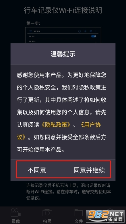 2、进入后同意并继续智慧眼记录仪app的用户协议;