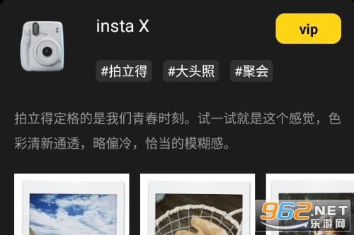 《Vita复古相机》是一款能够复现复古相机材质画质的相机软件,这款软件能够帮助我们获取到非常复古的相机滤镜,如果有想要还原的相机型号或者品牌,我们可以在这款软件中搜索到指定型号品牌的复古相机进行拍照处理,支持专业拍照调光处理,操作方便简单,适合专业手机摄影人士拍摄照片使用。