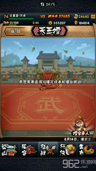 [乐游网导读]全民水浒新增天王擂台,玩家可以用自己已经拥有的英雄来组合阵容去挑战其他玩家的英雄组合,直到一方英雄全部没有战斗力则该擂台回合结束!那么怎样合理的安排阵容,也就成为了同等水平玩家该去考虑的问题了!