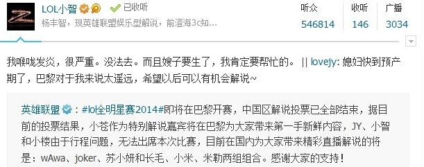 之前小智表示因身体不适将不参加2014全明星比赛的解说