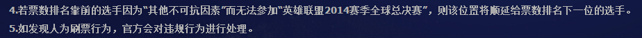 可以看出,小苍以身体状况不佳为由,宣布退出2014总决赛解说的行列。这不禁让人想到2014年英雄联盟全明星总决赛解说投票活动中得票第一的解说小智。他在投票活动结束后,也表示由于嗓子不适,退出全明星总决赛解说的行列。而且无巧不成书,我们在官方活动的投票规则中,也能发现相关的条例: